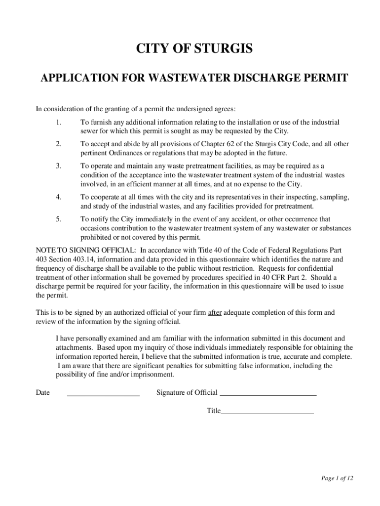 CITY OF STURGIS APPLICATION FOR WASTEWATER DISCHARGE PERMIT In consideration of the granting of a permit the undersigned agrees: 1.To furnish any additional information relating to the installation