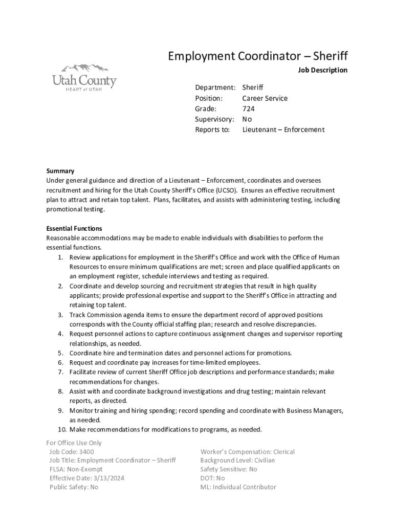 Employment Coordinator Sheriff Job DescriptionDepartment: Position: Grade: Supervisory: Reports to:Sheriff Career Service 724 No Lieutenant EnforcementSummary Under general guidance and direction
