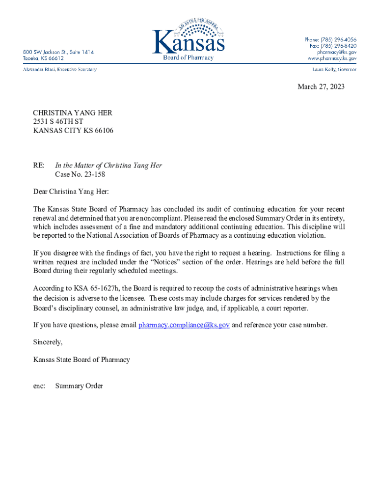 March 27, 2023, CHRISTINA YANG HER 2531 S 46TH ST KANSAS CITY KS 66106RE:In the Matter of Christina Yang Her Case No. 23158Dear Christina Yang Her: The Kansas State Board of Pharmacy has concluded