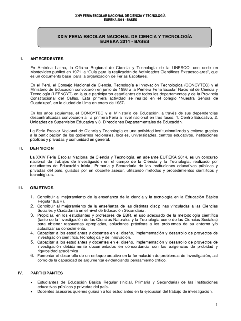 XXIV BERIA ESCOLAR NATIONAL DE COUNCIL Y TECHNOLOGY EUREKA 2014 BASESXXIV BERIA ESCOLAR NATIONAL DE COUNCIL Y TECHNOLOGY EUREKA 2014 BASES.ANTECEDENTS En Africa Latina, la Official Regional de Ciencia
