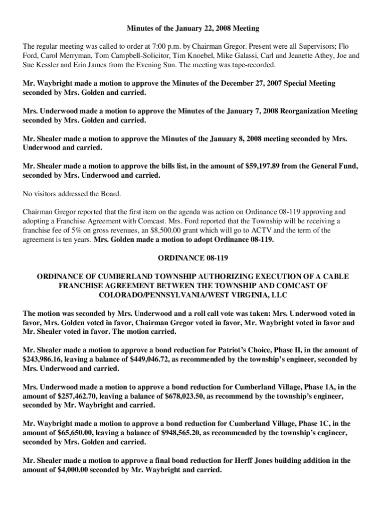 Minutes of the January 22, 2008, Meeting The regular meeting was called to order at 7:00 p.m. by Chairman Gregor. Present were all Supervisors; Flo Ford, Carol Ferryman, Tom CampbellSolicitor, Tim