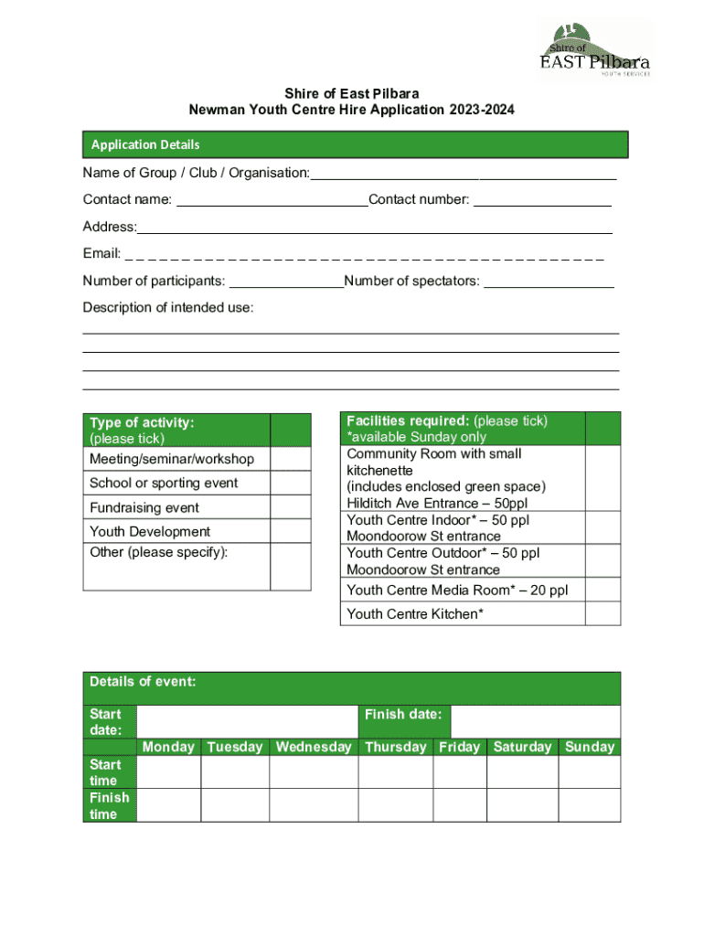 Shire of East Pillar Newman Youth Center Hire Application 20232024 Application Details Name of Group / Club / Organization:___ Contact name: ___Contact number: ___ Address:___ Email: _ _ _ _ _ _ _