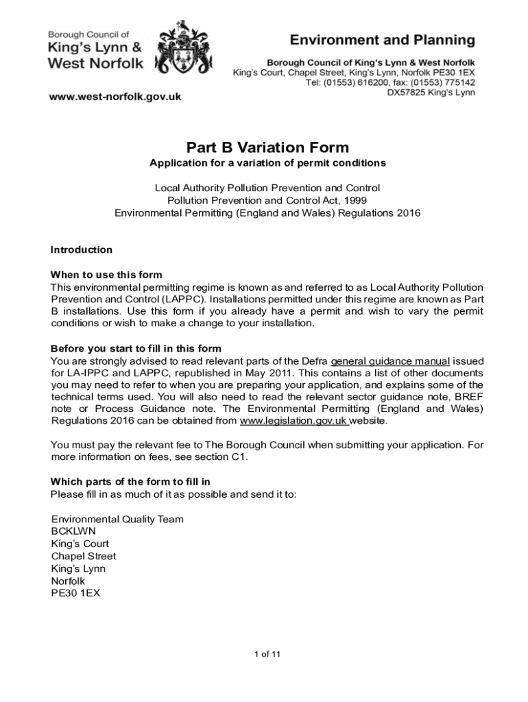 Part B Variation Form Application for a variation of permit conditions Local Authority Pollution Prevention and Control Pollution Prevention and Control Act, 1999 Environmental Permitting (England