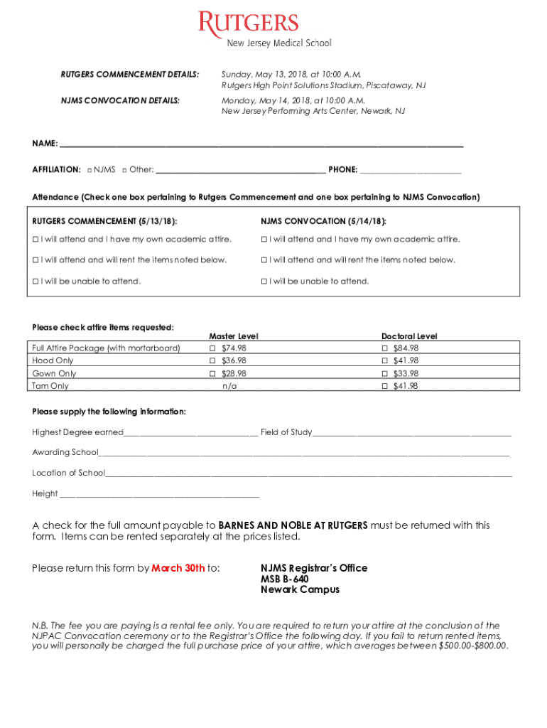 RUTGERS COMMENCEMENT DETAILS:Sunday, May 13, 2018, at 10:00 A.M. Rutgers High Point Solutions Stadium, Piscataway, NINJAS CONVOCATION DETAILS:Monday, May 14, 2018, at 10:00 A.M. New Jersey Performing