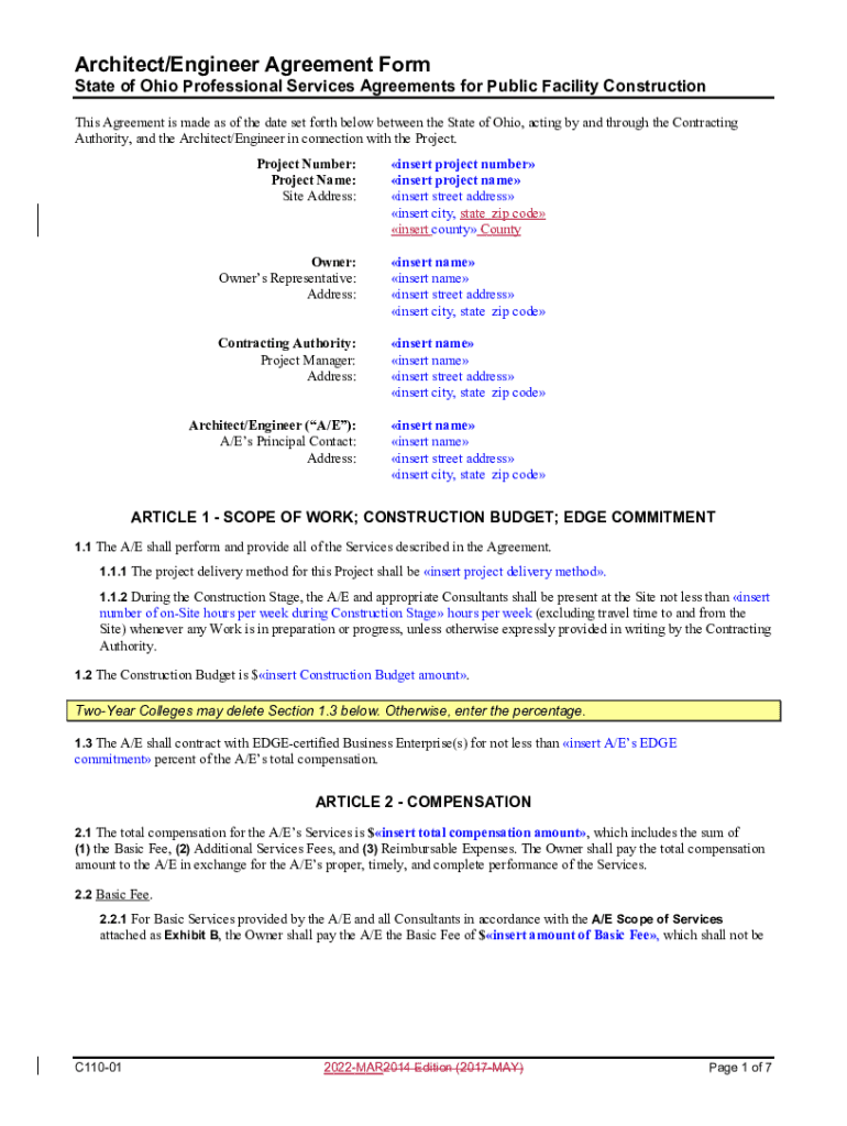 State of Ohio Professional Services Agreements for Public Facility Construction