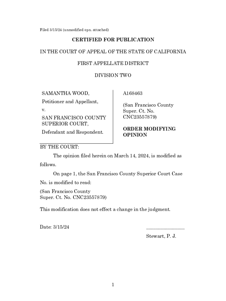 Filed 3/15/24 (unmodified on. Attached)CERTIFIED FOR PUBLICATION IN THE COURT OF APPEAL OF THE STATE OF CALIFORNIA FIRST APPELLATE DISTRICT DIVISION TWO SAMANTHA WOOD,A168463Petitioner and Appellant,