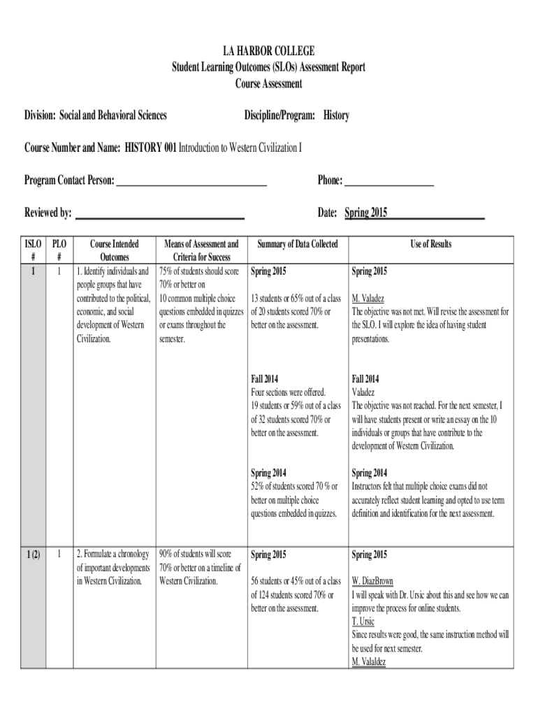 LA HARBOR COLLEGE Student Learning Outcomes (Los) Assessment Report Course Assessment Division: Social and Behavioral SciencesDiscipline/Program:HistoryCourse Number and Name: HISTORY 001 Introduction
