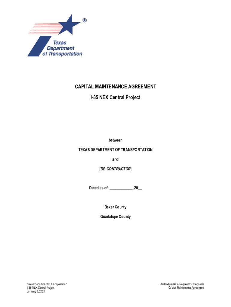 CAPITAL MAINTENANCE AGREEMENT I35 NEW Central Project between TEXAS DEPARTMENT OF TRANSPORTATION and [DB CONTRACTOR]Dated as of: ___, 20__Bexar County Guadalupe County Texas Department of Transportation