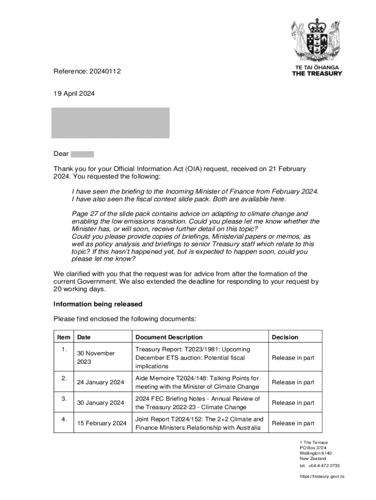 Reference: 2024011219 April 2024Dear Thank you for your Official Information Act (OIL) request, received on 21 February 2024. You requested the following: I have seen the briefing to the Incoming