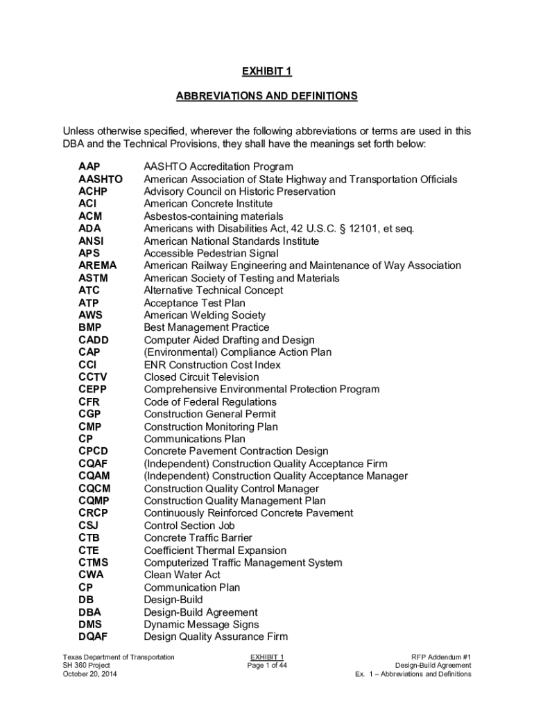 EXHIBIT 1 ABBREVIATIONS AND DEFINITIONS Unless otherwise specified, wherever the following abbreviations or terms are used in this DBA and the Technical Provisions, they shall have the meanings set