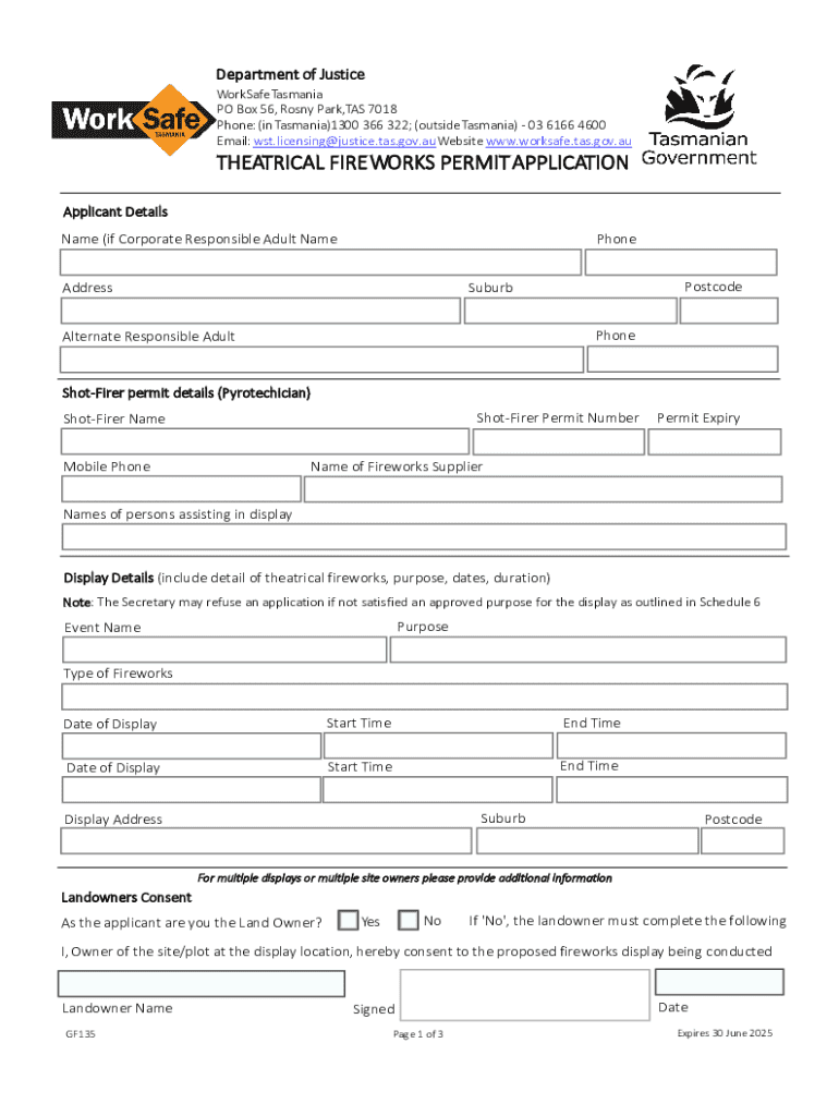 Get the free THEATRICAL FIRE WORKS PERMIT APPLICATION - worksafe tas gov