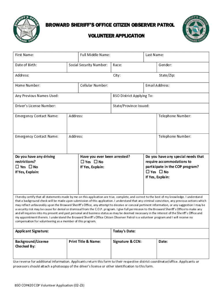 BROWARD SHERIFFS OFFICE CITIZEN OBSERVER PATROL VOLUNTEER APPLICATIONFirst Name: Date of Birth:Full Middle Name: Social Security Number:Address: Home Number:Last Name: Race:Gender:City:State/Zip:Cellular