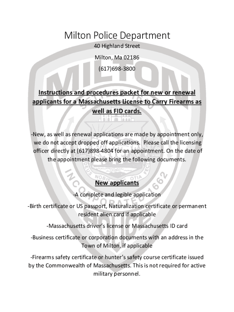 Milton Police Department 40 Highland Street Milton, Ma 02186 (617)6983800Instructions and procedures packet for new or renewal applicants for a Massachusetts License to Carry Firearms as well as FID