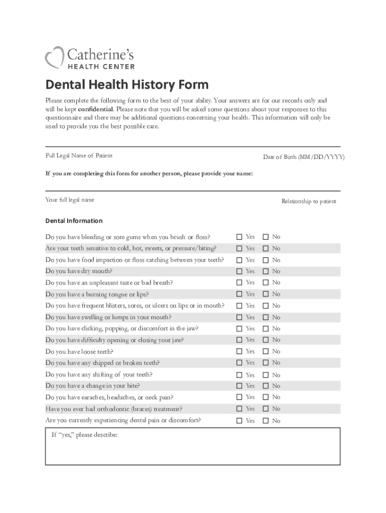 Dental Health History Form Please complete the following form to the best of your ability. Your answers are for our records only and will be kept confidential. Please note that you will be asked some