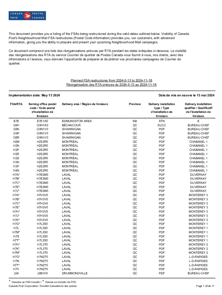 This document provides you a listing of the FSA's being restructured during the valid dates outlined below. Visibility of Canada
