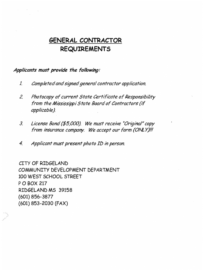 GENERAL CONTRACTOR REQUIREMENTS Applicants must provide the following: 1.Completed and signedgeneral contractor application.2.Photocopy of current State Certificate of Responsibility from the Mississippi