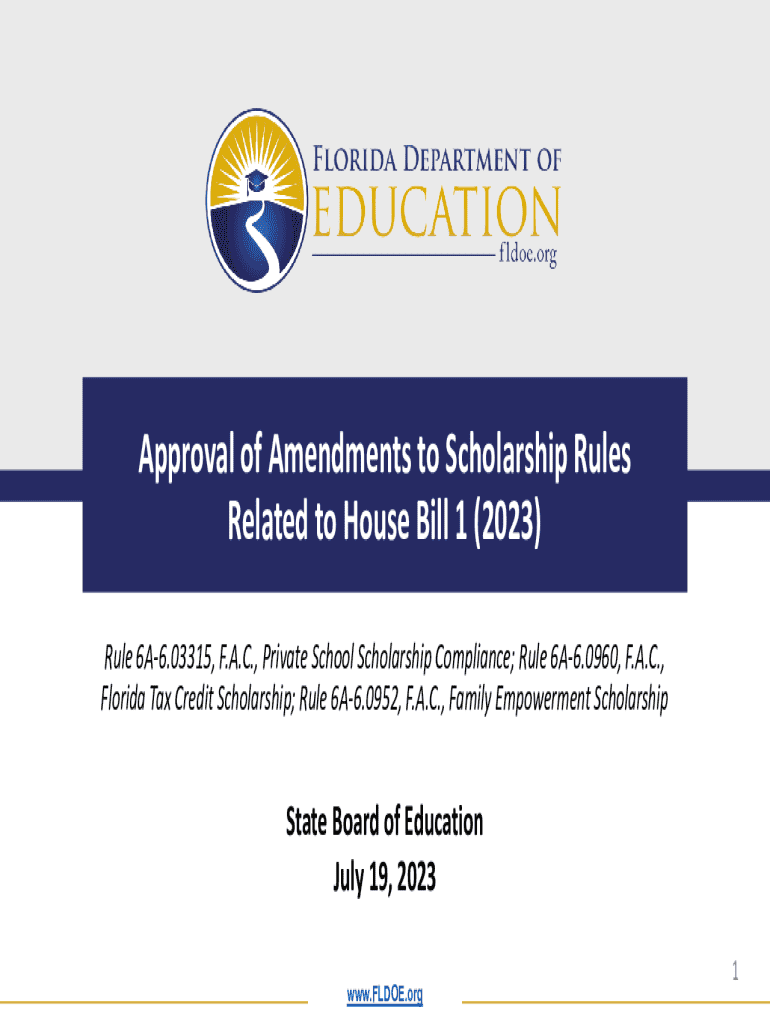 Approval of Amendments to Scholarship Rules Related to House Bill 1 (2023) Rule 6A6.03315, F.A.C., Private School Scholarship Compliance; Rule 6A6.0960, F.A.C., Florida Tax Credit Scholarship; Rule