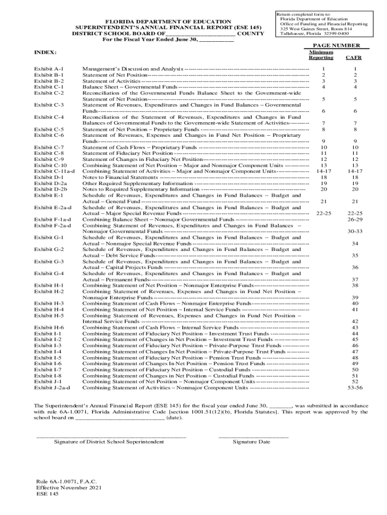 FLORIDA DEPARTMENT OF EDUCATION SUPERINTENDENTS ANNUAL FINANCIAL REPORT (ESE 145) DISTRICT SCHOOL BOARD OF___ COUNTY For the Fiscal Year Ended June 30, ___Return completed form to: Florida Department