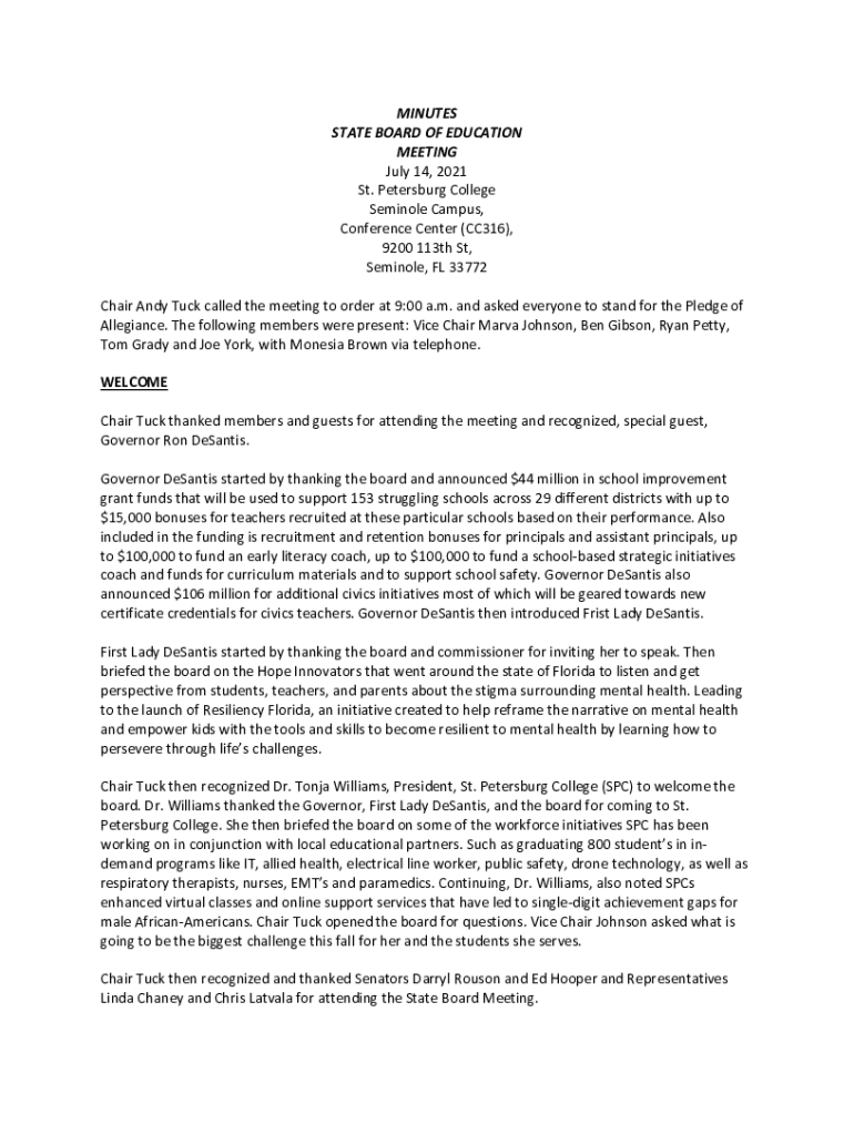 MINUTES STATE BOARD OF EDUCATION MEETING July 14, 2021, St. Petersburg College Seminole Campus, Conference Center (CC316), 9200 113th St, Seminole, FL 33772 Chair Andy Tuck called the meeting to order