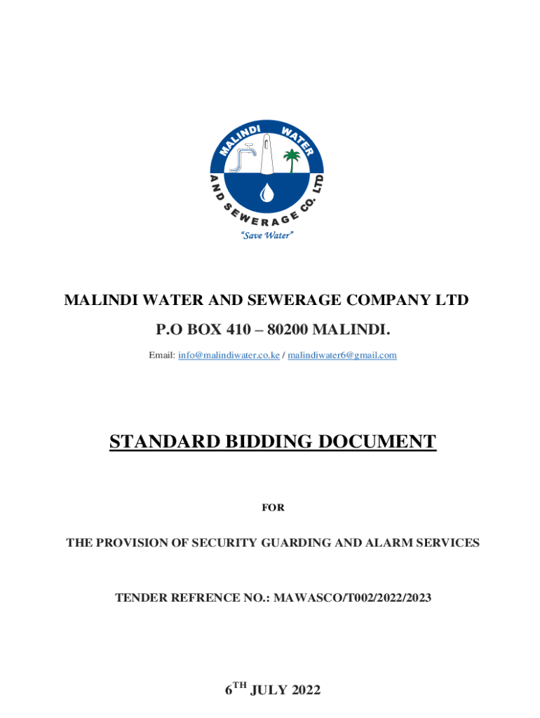 MALINDI WATER AND SEWERAGE COMPANY LTD P.O BOX 410 80200 MALINDI. Email: info@malindiwater.co.ke / malindiwater6@gmail.comSTANDARD BIDDING DOCUMENTFORTHE PROVISION OF SECURITY GUARDING AND ALARM SERVICESTENDER