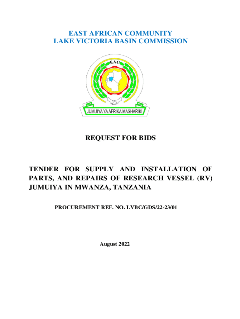 EAST AFRICAN COMMUNITY LAKE VICTORIA BASIN COMMISSIONREQUEST FOR BUDTENDER FOR SUPPLY AND INSTALLATION OF PARTS, AND REPAIRS OF RESEARCH VESSEL (RV) JUMPING IN WANNA, TANZANIA PROCUREMENT REF. NO.