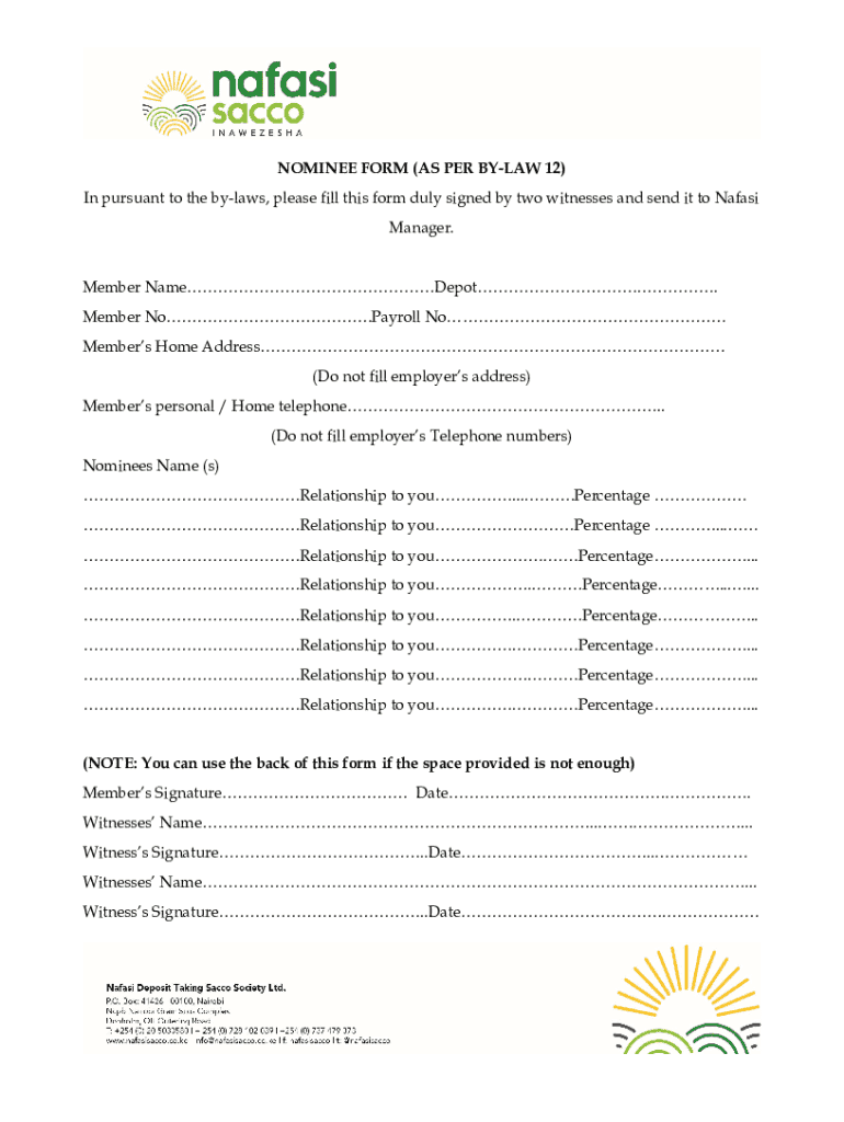 NOMINEE FORM (AS PER BYLAW 12) In pursuant to the bylaws, please fill this form duly signed by two witnesses and send it to Nafasi Manager. Member NameDepot.. Member No.Payroll No Members Home Address