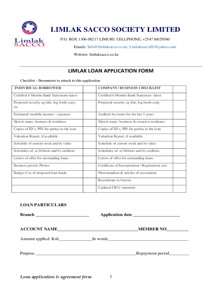 LIMLAK SACCO SOCIETY LIMITED P.O. BOX 130600217 LIMURU CELLPHONE; +254716029560 Emails: Info@limlaksacco.co.ke, Limlaksacco03@yahoo.com Website: limlaksacco.co.keLIMLAK LOAN APPLICATION FORM Checklist