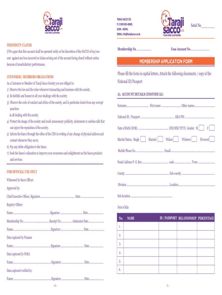Serial No.___INDEMNITY CLAUSE I/We agree that this account shall be operated solely at the discretion of the SACCO of my/membership No.........................cost against any loss incurred or claims