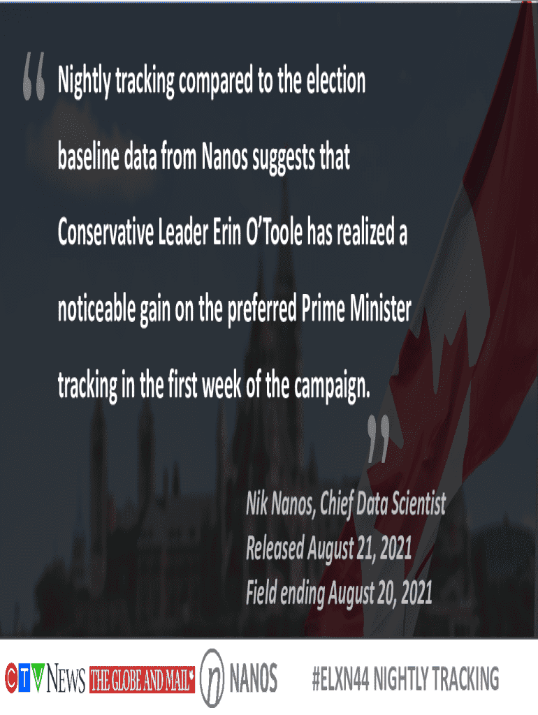 1Nightly tracking compared to the election baseline data from Nanos suggests that Conservative Leader Erin OToole has realized a noticeable gain on the preferred Prime Minister tracking in the first
