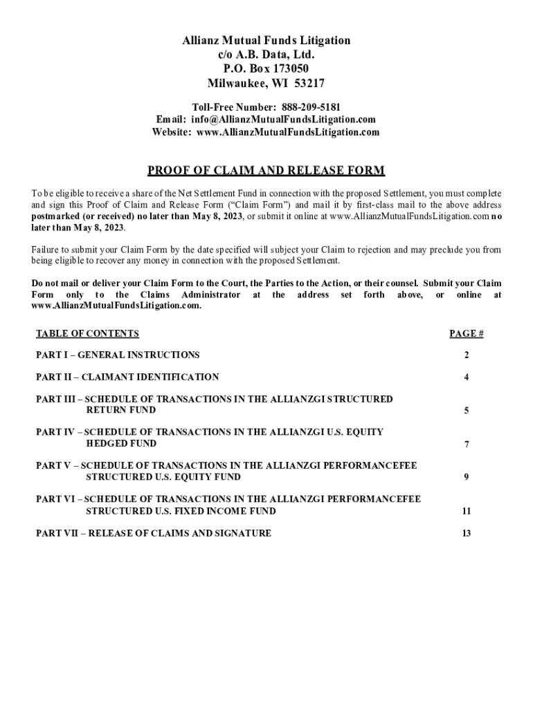 Allianz Mutual Funds Litigation c/o A.B. Data, Ltd. P.O. Box 173050 Milwaukee, WI 53217 Toll-free Number: 8882095181 Email: info@AllianzMutualFundsLitigation.com Website: www.AllianzMutualFundsLitigation.comPROOF