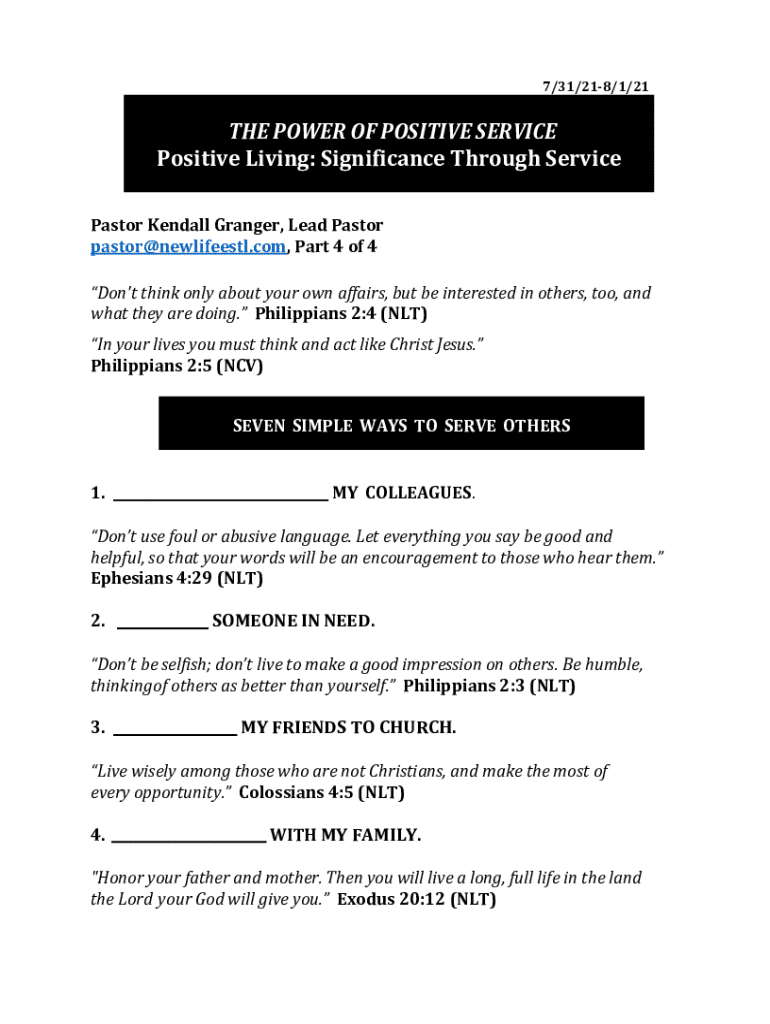 7/31/218/1/21THE POWER OF POSITIVE SERVICE Positive Living: Significance Through Service Pastor Kendall Granger, Lead Pastor pastor@newlifeestl.com, Part 4 of 4 Don\'t think only about your own affairs,