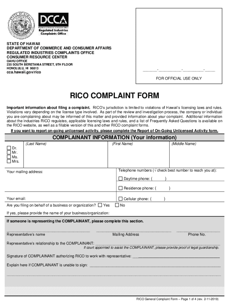 Get the free RICO COMPLAINT FORM