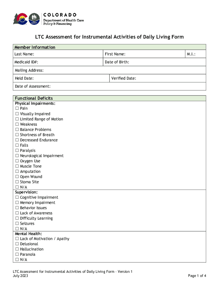 LTC Assessment for Instrumental Activities of Daily Living Form Member Information Last Name:First Name:Medicaid ID#:Date of Birth:M.I.:Mailing Address: Held Date:Verified Date:Date of Assessment:Functional