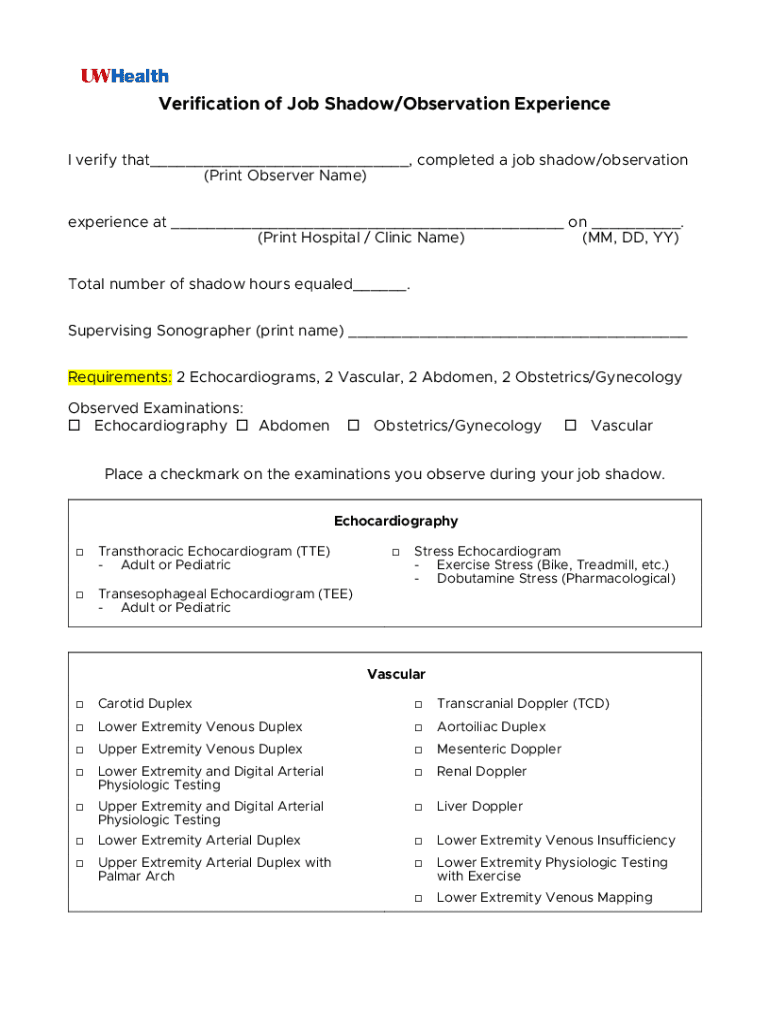 Verification of Job Shadow/Observation Experience I verify that___, completed a job shadow/observation (Print Observer Name) experience at ___ on ___. (Print Hospital / Clinic Name) (MM, DD, YY) Total
