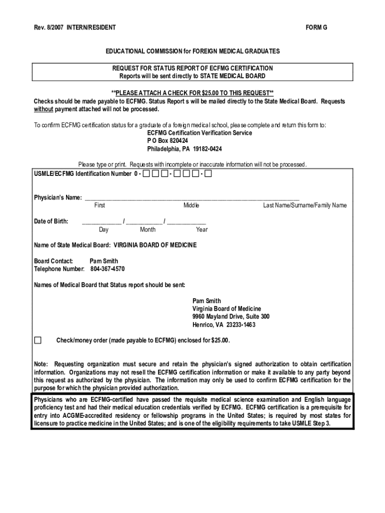 Rev. 8/2007 INTERN/RESIDENTFORM EDUCATIONAL COMMISSION for FOREIGN MEDICAL GRADUATES REQUEST FOR STATUS REPORT OF EC FMG CERTIFICATION Reports will be sent directly to STATE MEDICAL BOARD **PLEASE