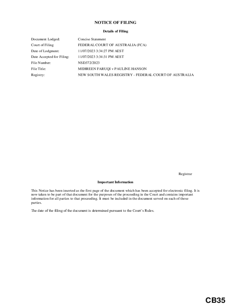 Document Lodged:Concise StatementCourt of FilingFEDERAL COURT OF AUSTRALIA (FCA)Date of Judgment:11/07/2023 3:34:27 PM Estate Accepted for Filing:11/07/2023 3:34:31