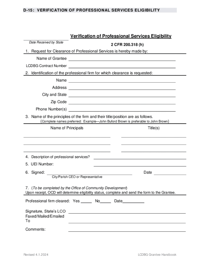D15 : VERIFICATION OF P ROFESSIONAL SERVICES ELIGIBILITYVerification of Professional Services Eligibility Date Received by State2 CFR 200.318 (h)1. Request for Clearance of Professional Services is