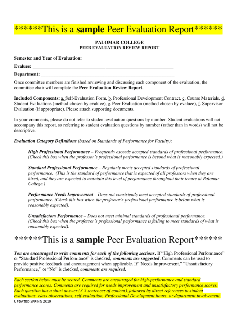 ******This is a sample Peer Evaluation Report****** PALOMAR COLLEGE PEER EVALUATION REVIEW REPORTSemester and Year of Evaluation: ___ Evaluee: ___ Department: ___ Once committee members are finished