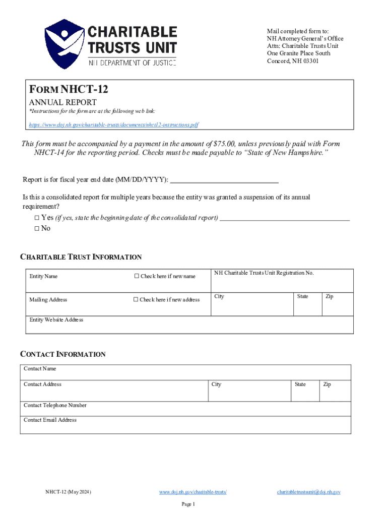 Mail completed form to: NH Attorney Generals Office Attn: Charitable Trusts Unit One Granite Place South Concord, NH 03301FORM NHCT12 ANNUAL REPORT*Instructions for the form are at the following web