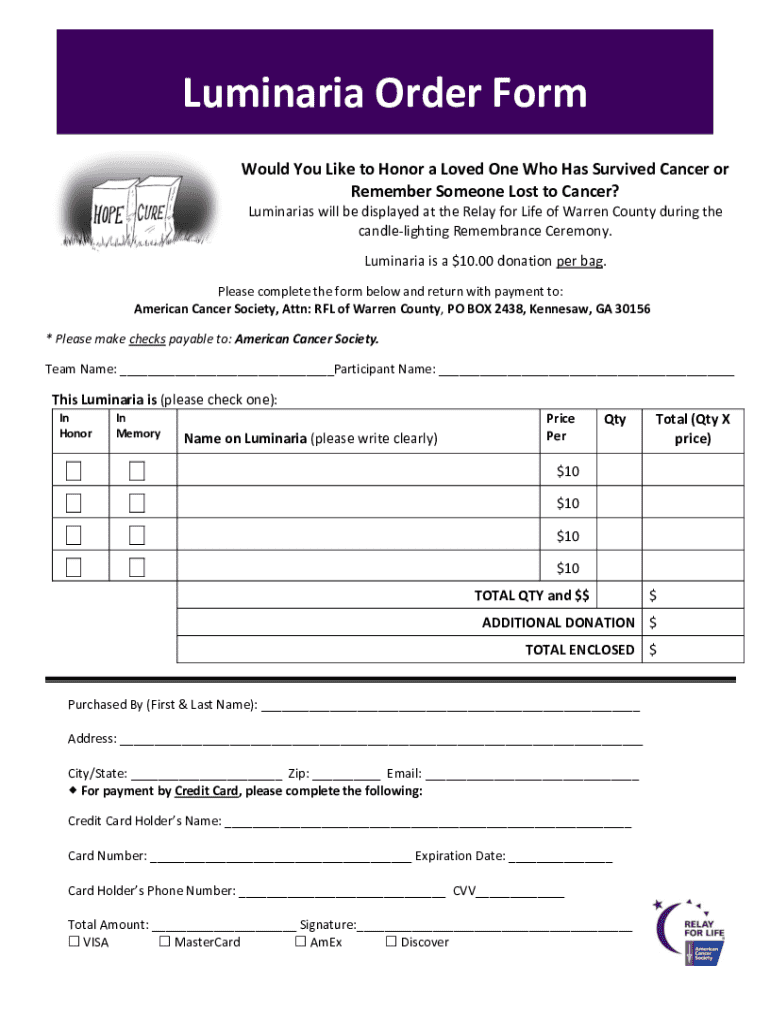 Luminaria Order Form Would You Like to Honor a Loved One Who Has Survived Cancer or Remember Someone Lost to Cancer? Luminarias will be displayed at the Relay for Life of Warren County during the