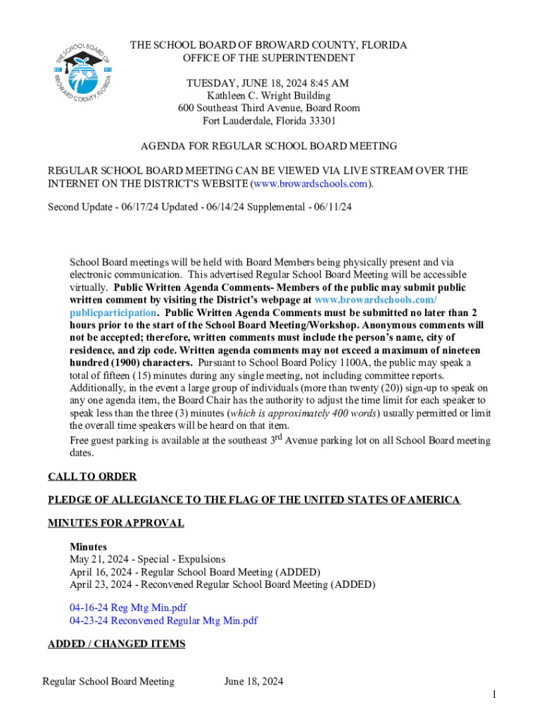 THE SCHOOL BOARD OF BROWARD COUNTY, FLORIDA OFFICE OF THE SUPERINTENDENT TUESDAY, JUNE 18, 2024 8:45 AM Kathleen C. Wright Building 600 Southeast Third Avenue, Board Room Fort Lauderdale, Florida