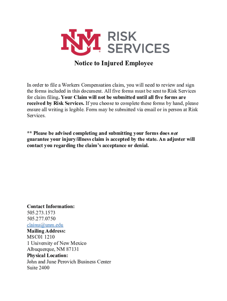 Notice to Injured Employee In order to file a Workers Compensation claim, you will need to review and sign the forms included in this document. All five forms must be sent to Risk Services for claim