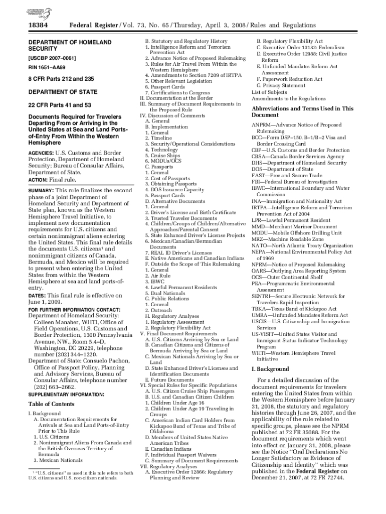 18384Federal Register / Vol. 73, No. 65 / Thursday, April 3, 2008 / Rules and RegulationsDEPARTMENT OF HOMELAND SECURITY [US CBP 20070061] IN 1651AA698 CFR Parts 212 and 235 DEPARTMENT OF STATE 22