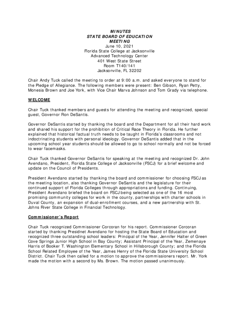 MINUTES STATE BOARD OF EDUCATION MEETING June 10, 2021 Florida State College at Jacksonville Advanced Technology Center 401 West State Street Room T140/141 Jacksonville, FL 32202 Chair Andy Tuck called