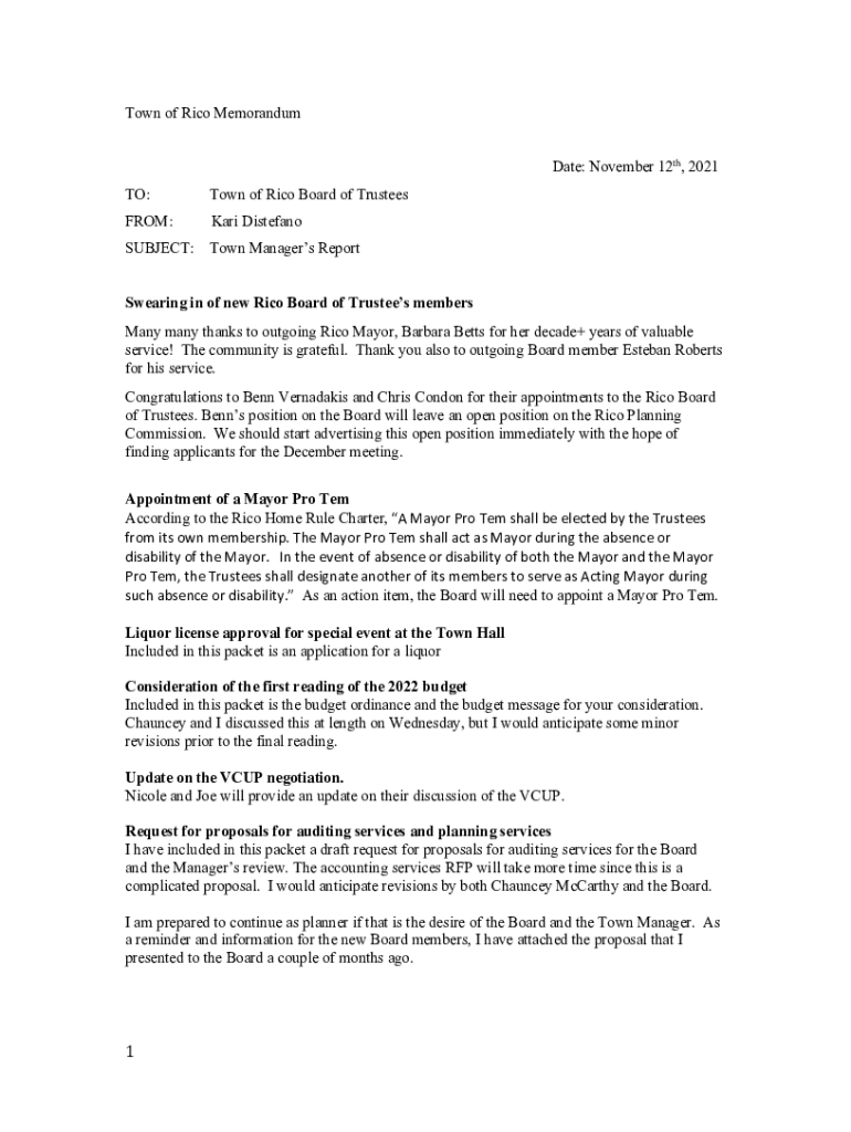 TO:Town of Rico Board of TrusteesFROM:Kari DistefanoSUBJECT:Town Managers ReportS wearing in of new Rico Board of Trustees members