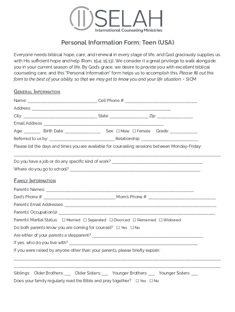 Personal Information Form: Teen (USA) Everyone needs biblical hope, care, and renewal in every stage of life, and God graciously supplies us with His sufficient hope and help (Rom. 15:4; 15:13). We