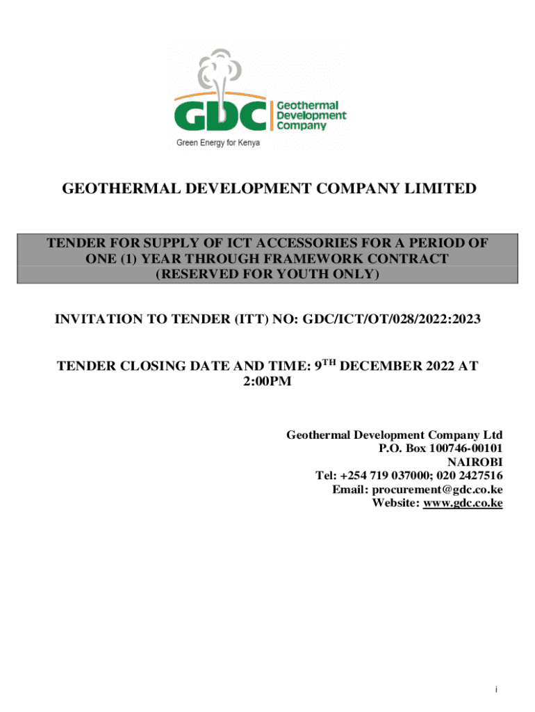 GEOTHERMAL DEVELOPMENT COMPANY LIMITEDTENDER FOR SUPPLY OF ICT ACCESSORIES FOR A PERIOD OF ONE (1) YEAR THROUGH FRAMEWORK CONTRACT (RESERVED FOR YOUTH ONLY) INVITATION TO TENDER (ITT) NO: GDC/ICT/OT/028/2022:2023