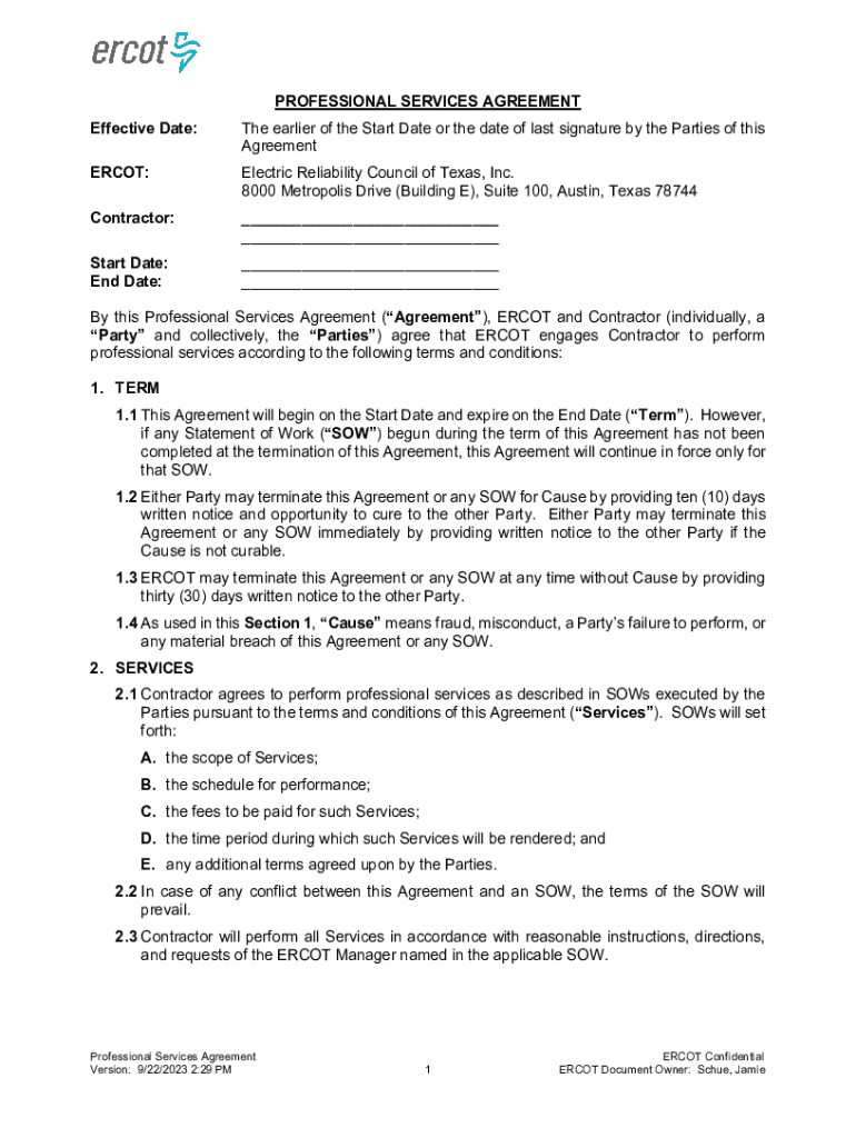 PROFESSIONAL SERVICES AGREEMENT Effective Date:The earlier of the Start Date or the date of last signature by the Parties of this AgreementERCOT:Electric Reliability Council of Texas, Inc. 8000 Metropolis