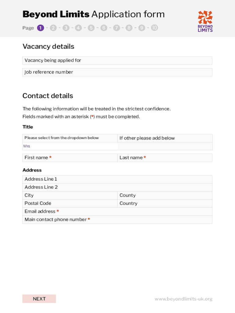 Beyond Limits Application form Page123456789Vacancy details Vacancy being applied for Job reference number Contact details The following information will be treated in the strictest confidence. Fields