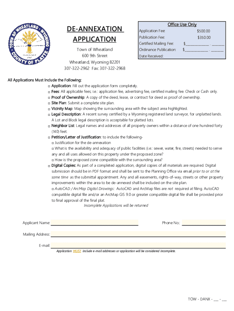 DEANNEXATION APPLICATION Town of Wheatland 600 9th Street Wheatland, Wyoming 82201 3073222962 Fax: 3073222968Office Use Only Application Fee:$500.00Publication Fee:$350.00Certified Mailing Fee:$___